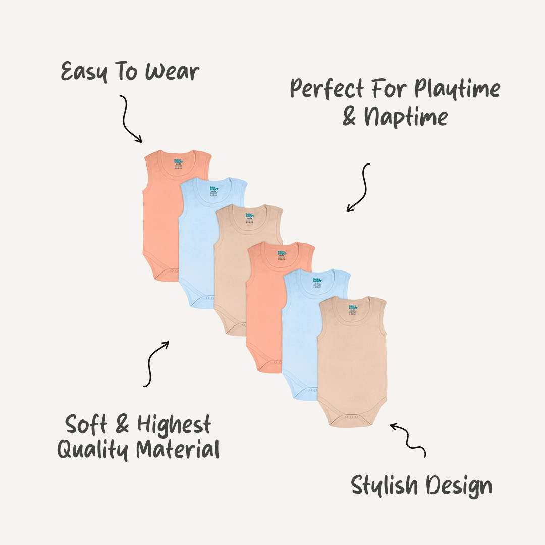 Babies Basic - 6pc-Set - 100% Cotton Sleeveless Bodysuit ‚ Blue, Brown, Orange