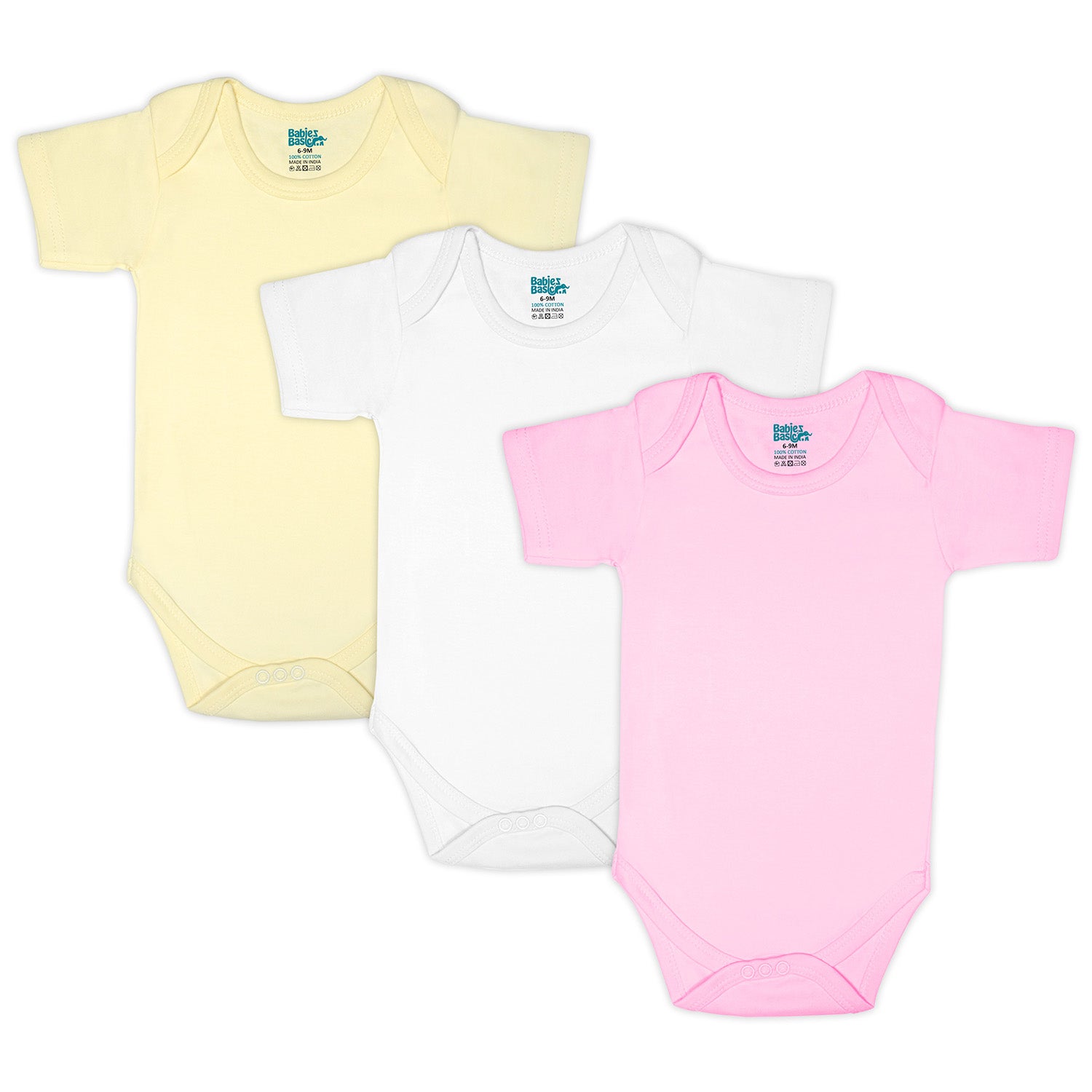 Set of 3 Short Sleeves Rompers/Bodysuits (Pink, Lemon, Cream) - Up to 24 Months | 100% Cotton | For Soft & Vibrant Comfort