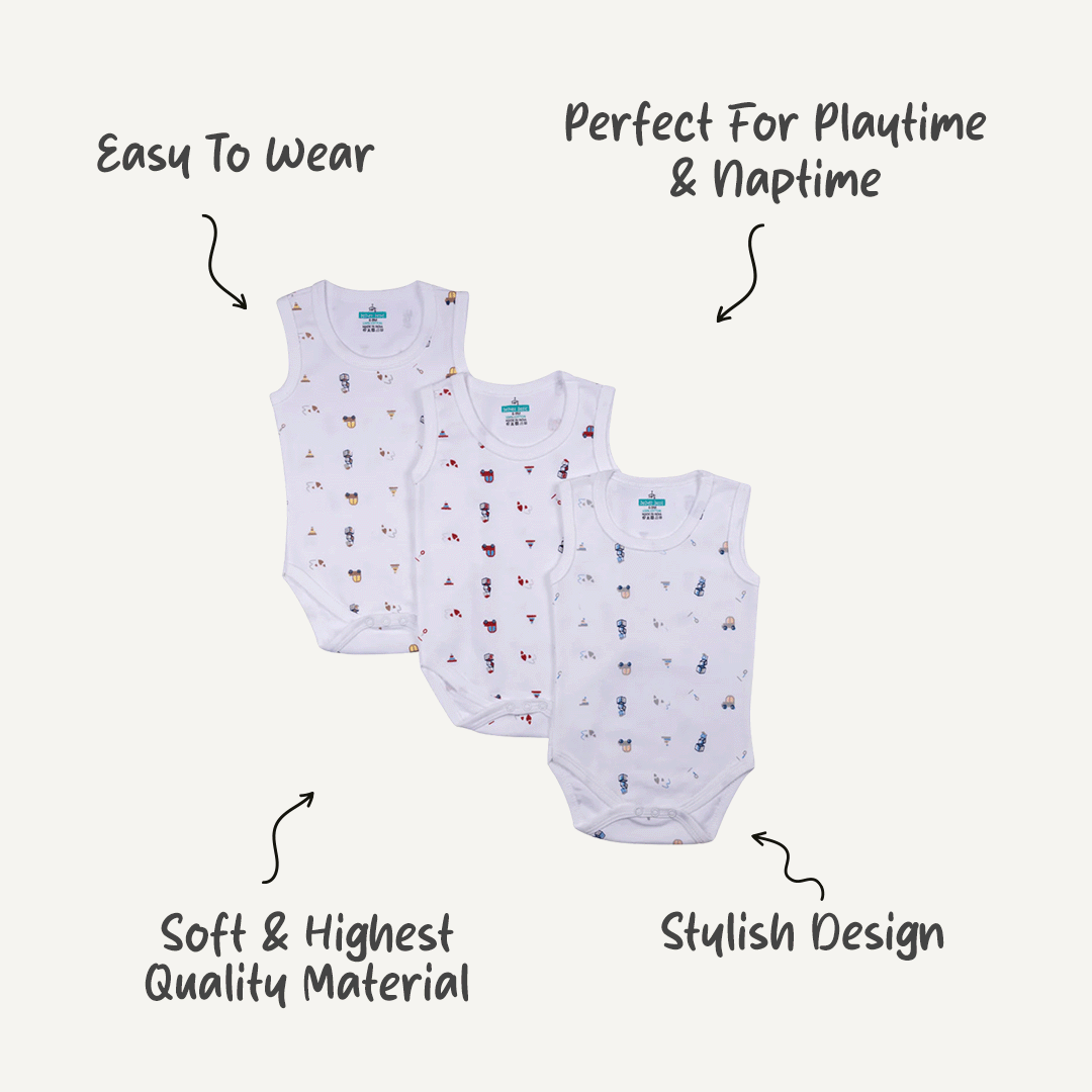 Set of 3 Sleeveless Rompers/Bodysuits - Printed Designs | Up to 24 Months | 100% Cotton | For Fun & Comfortable Baby Wear