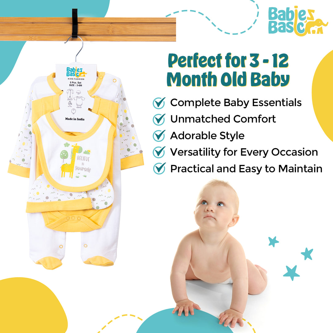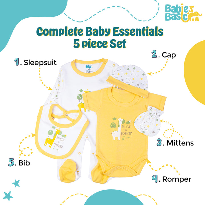 • Complete Baby Essentials: Our Babies Basic 5 Piece Set is the ultimate solution for dressing your little one. It includes a sleepsuit, romper, mittens, bib, and cap, offering a complete package of essential items.