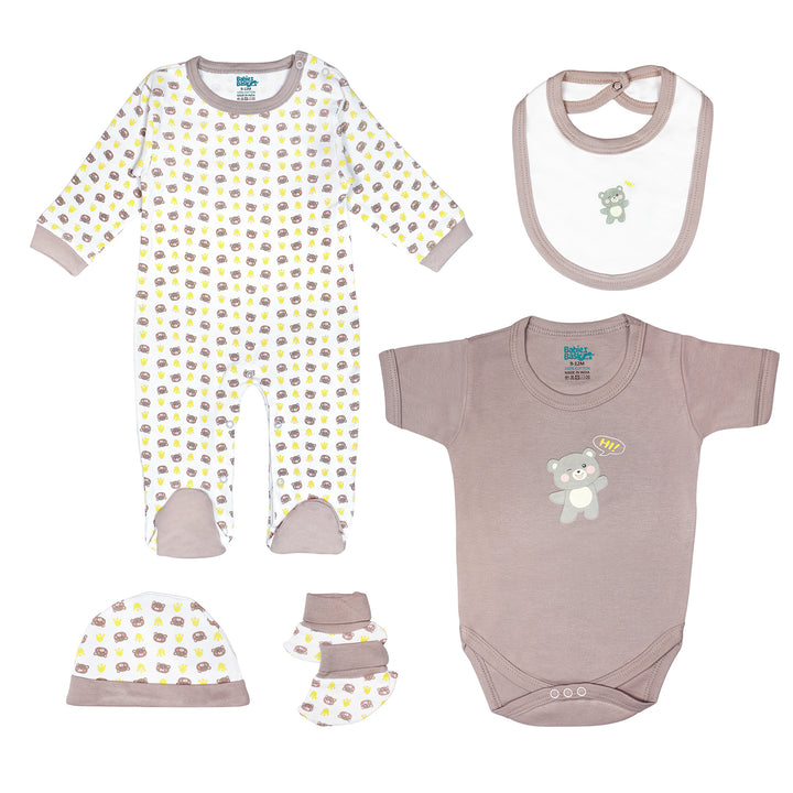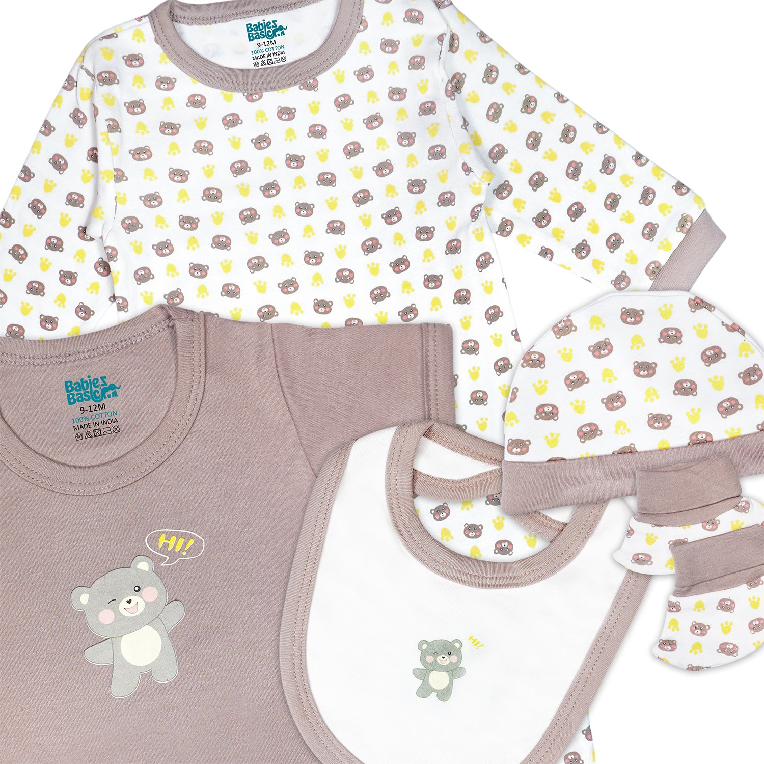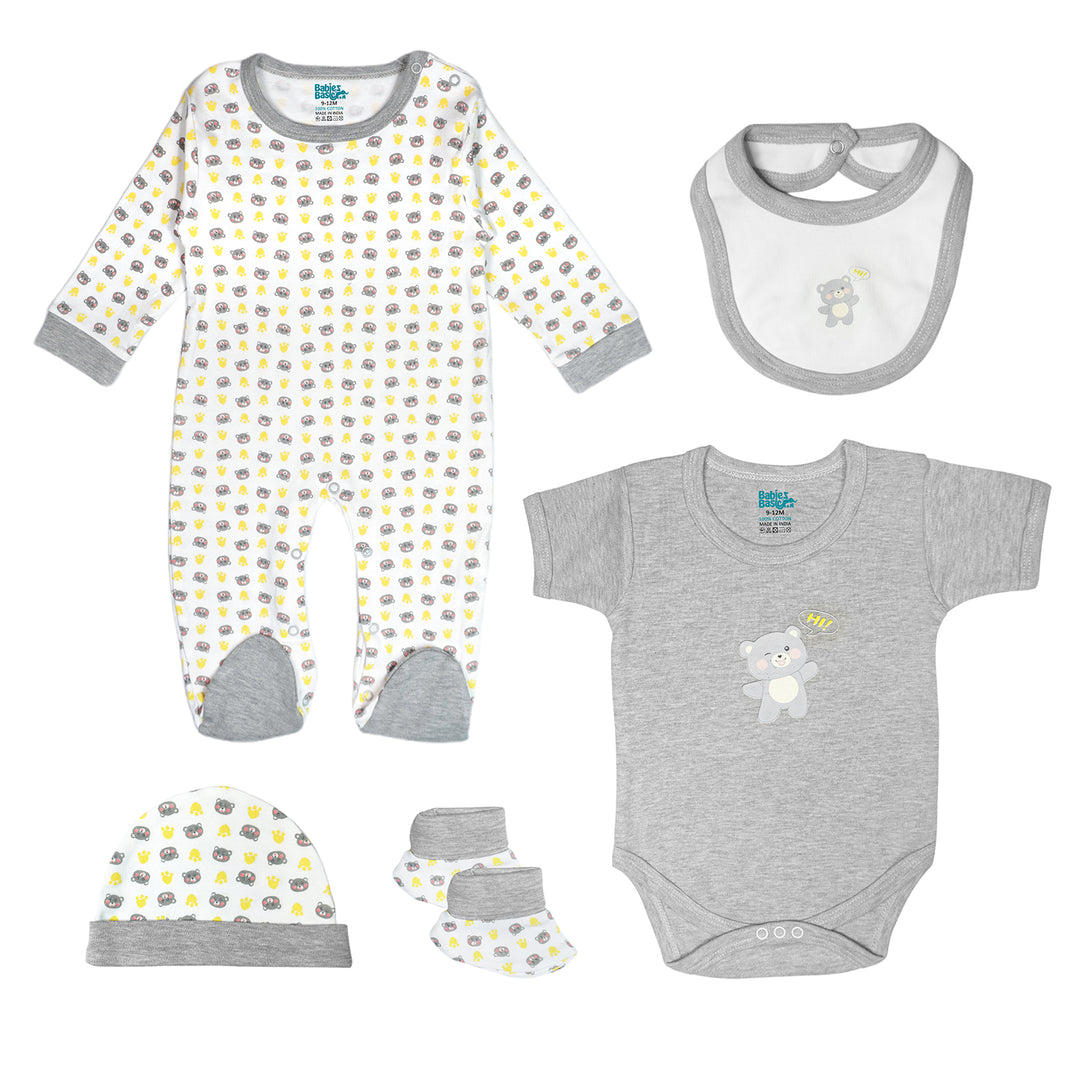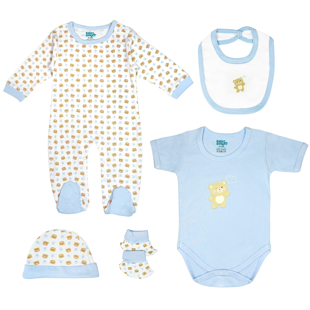 • Complete Baby Essentials: Our Babies Basic 5 Piece Set is the ultimate solution for dressing your little one. It includes a sleepsuit, romper, mittens, bib, and cap, offering a complete package of essential items.