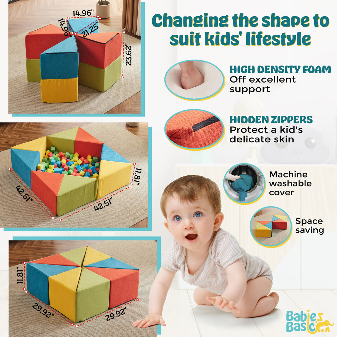 Exploring Infinite Creativity : Our magical cube, composed of 8 triangles, can be reshaped into various forms such as a ball pit, children's sofa, throne, mattress, and more, seamlessly blending leisure and entertainment to offer children a space for emotional release and joyous play. When not in adventure mode, the baby ball pit effortlessly transitions into a chic sofa, saving space and facilitating convenient storage.